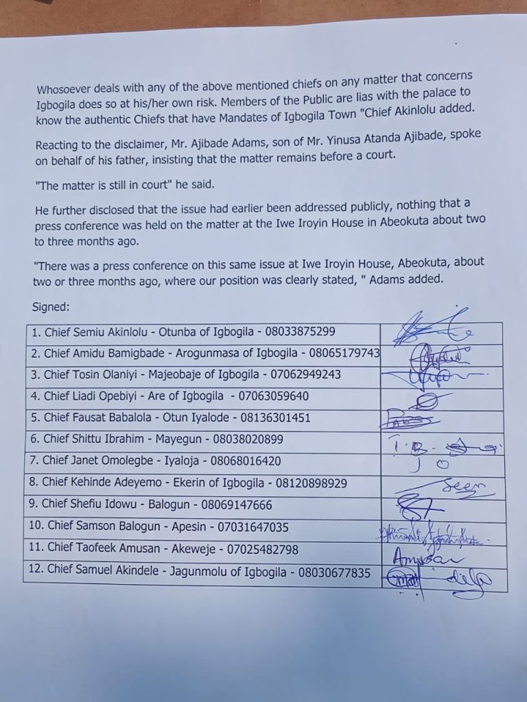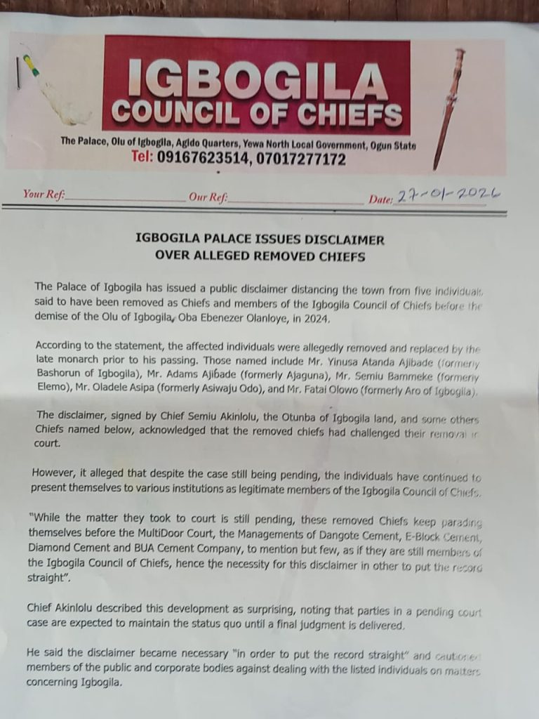 The disclaimer, signed by Chief Semiu Akinlolu, Otunba of Igbogila land, acknowledged that the affected chiefs had challenged their removal in court. However, the Palace alleged that despite the matter still being pending, the individuals have continued to present themselves to various institutions as legitimate members of the Igbogila Council of Chiefs.