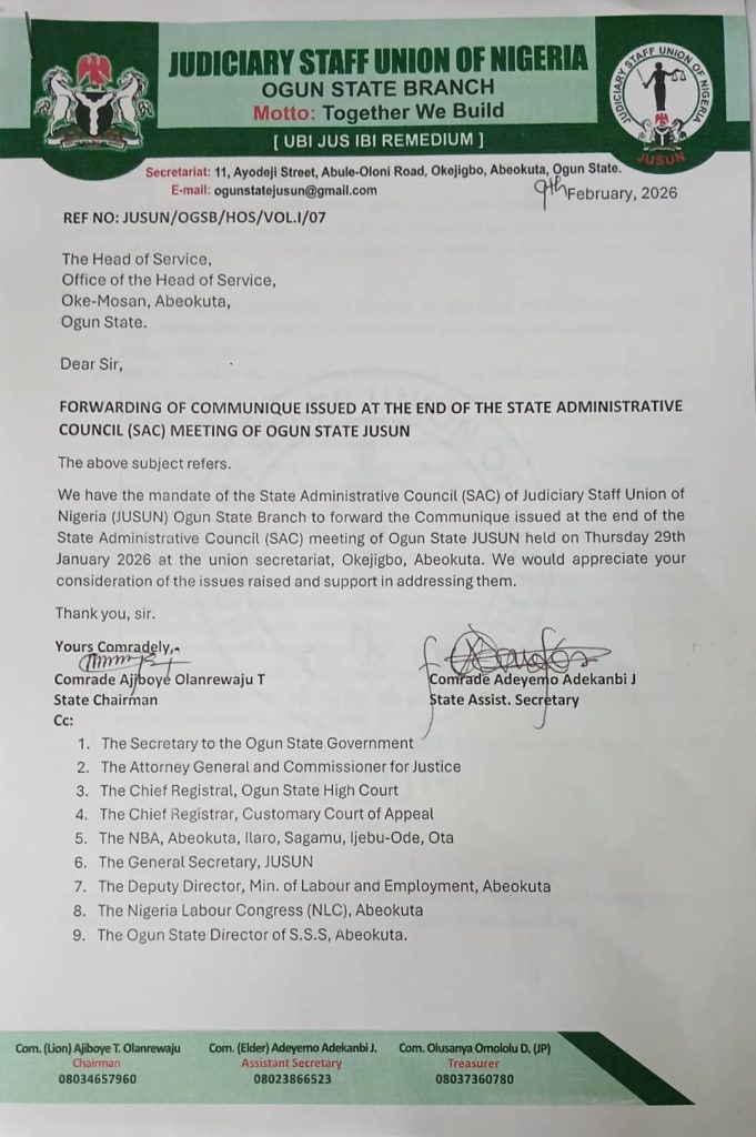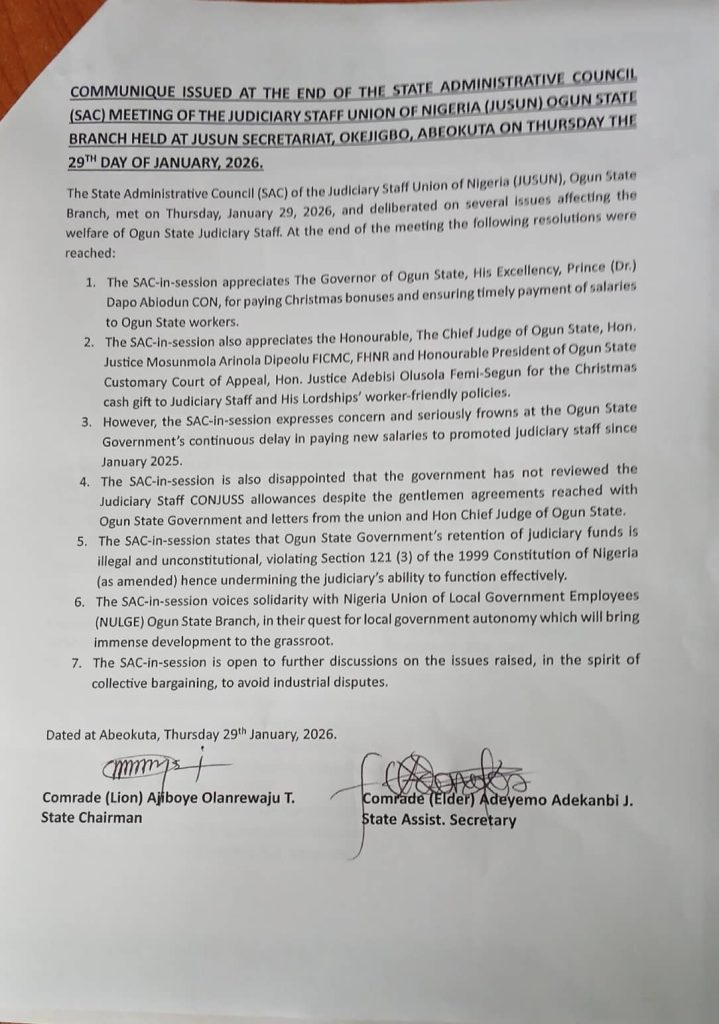 The concerns were contained in a communiqué issued at the end of the State Administrative Council (SAC) meeting of the union, held on Thursday, January 29, 2026, at the JUSUN Secretariat, Okejigbo, Abeokuta.